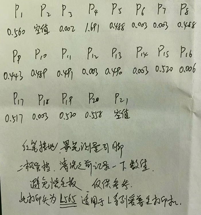 备注:主板上的排线座有标示1-21号,喷头端排线座没有标示从左至右为21-1号与主板倒序;使用万用表二极管档位测试,红表笔接地,黑表笔测试各脚位,空值:表示无穷大,0值:表示短路。