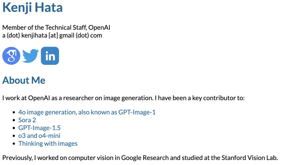 从团队成员Kenji Hata的自我介绍中得知,GPT Image 1.0也就是GPT-4o的图像生成部分。