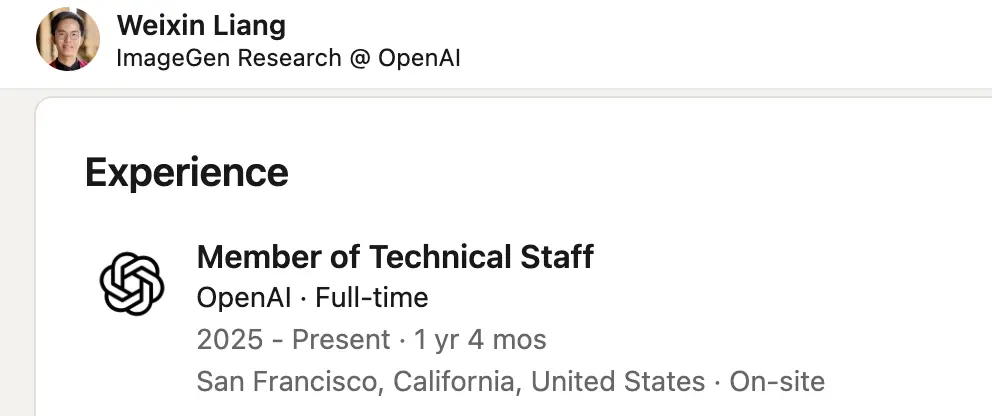 Weixin Liang与陈博远一样都是25年博士刚毕业就加入OpenAI,迅速成为团队的核心成员。