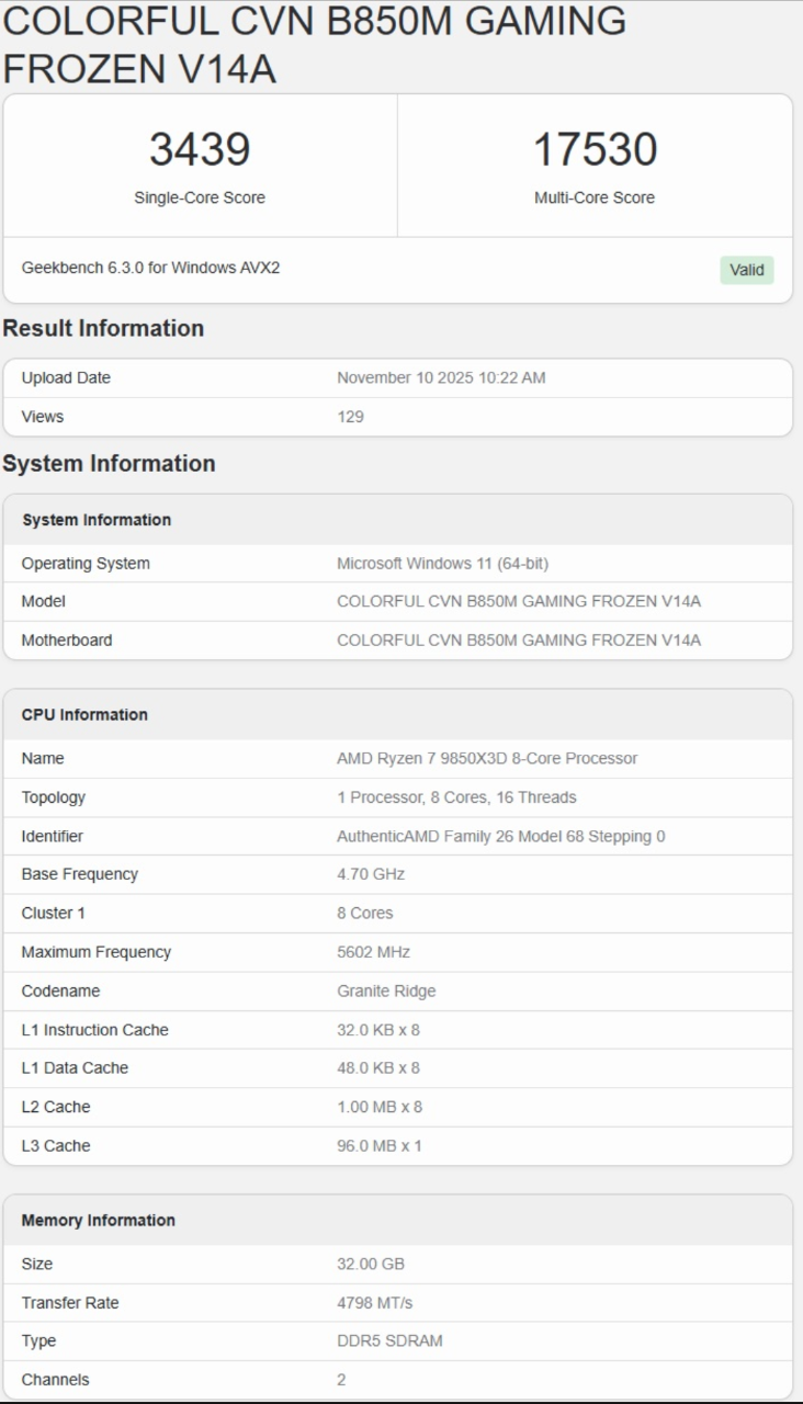 AMD的锐龙9800X3D处理器推出之后毫无悬念地成为最佳游戏CPU,如今它的继任者锐龙7 9850X3D也来了,性能跑分也已曝光。网友@Olrak29_曝光了GeekBench数据库中的锐龙7 9850X3D跑分,搭配的主板有七彩虹和铭瑄的,但是两个测试中的频率不一样,前者是5.6GHz,后者识别的只有5.38GHz,比传闻的频率低了200MHz。
