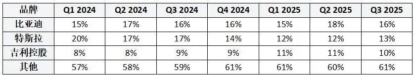 吉利控股集团以10%的全球BEV市场份额位列全球第三,2025年Q3 BEV销量同比增长51%。