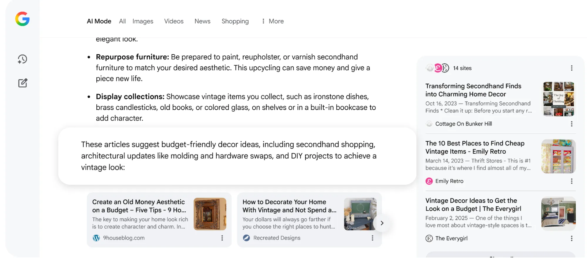 Google展示的示例中,AI 模式在搜索结果页顶部给出一段概括性文字,紧接着在其下方以轮播形式列出相关网站链接,例如在回答“如何用低预算打造复古家居风格”时,系统会先用一段话总结这些文章主要提供的二手淘货建议、建筑细节改造思路(如线条、五金更换)以及 DIY 项目等内容,然后再呈现各家媒体的链接入口。 Google同时表示,用户今后会在 AI 模式生成的回答中看到更多被加上超链接的词语或短语,并配套一段对嵌入式来源的 AI 描述,以帮助理解这些链接的价值。