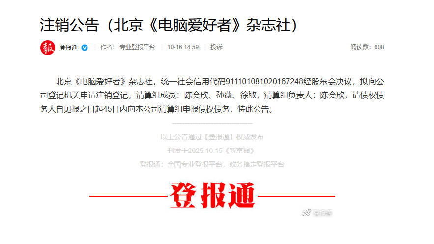 注销公告显示,北京《电脑爱好者》杂志社经股东会决议申请注销登记,清算组成员由陈会欣、孙薇、徐敏组成,要求债权债务人45日内申报债权债务。