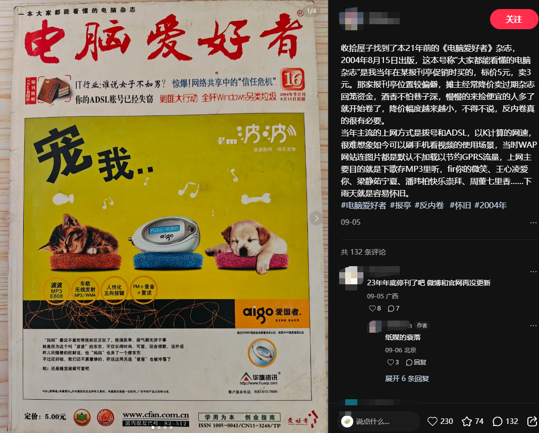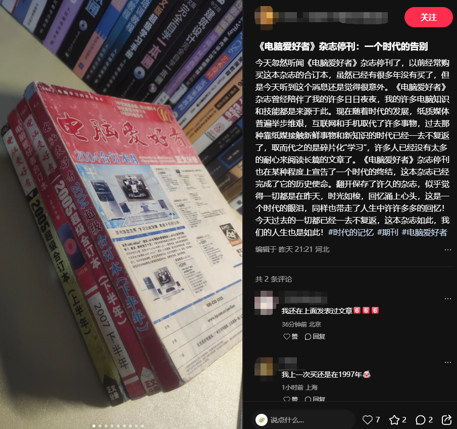 消息传出后,不少网友在社交平台留言感慨:“《电脑爱好者》我订过,当年的光盘给我打开了新世界。”“真的是童年的回忆,以前经常跑报刊亭买。”