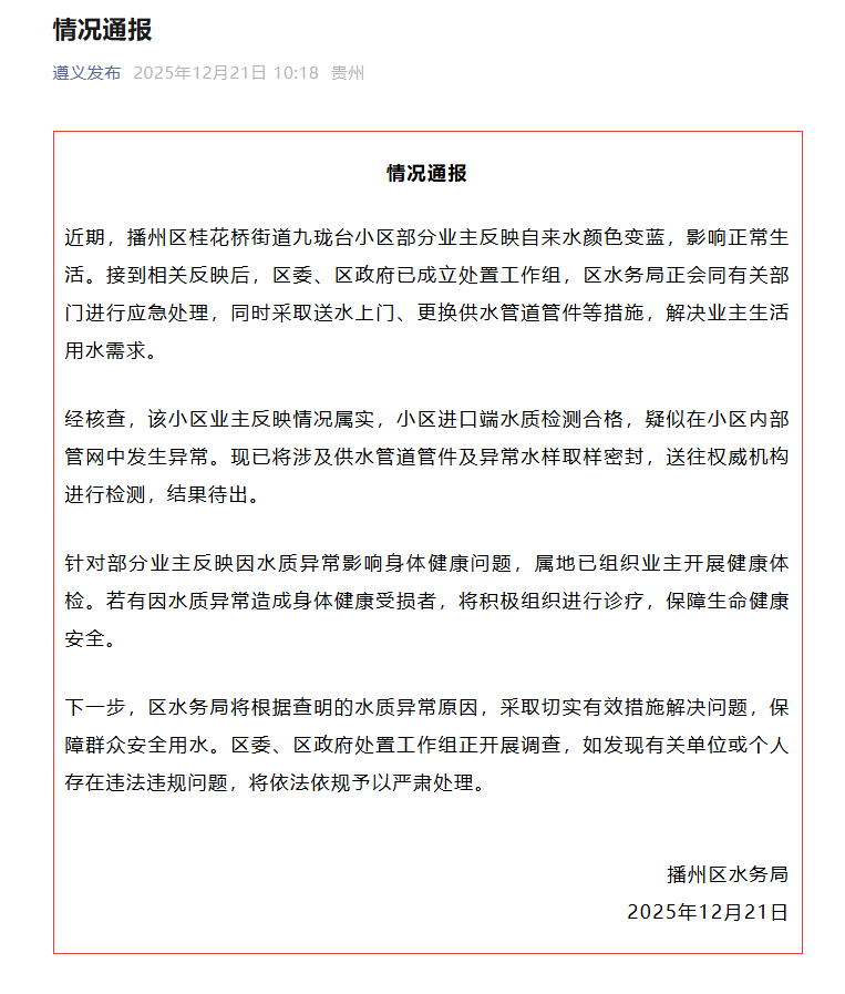 近期,贵州遵义九珑台小区部分业主反映,自来水的颜色变蓝了,影响正常生活。今日,贵州“遵义发布”发文,播州区水务局发布情况通报:在接到相关反映后,区委、区政府已成立处置工作组,区水务局正会同有关部门进行应急处理。