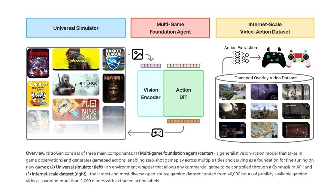 NVIDIA研究团队日前正式开源发布了全新的基础模型NitroGen。这是一款以“玩游戏”为核心训练目标的模型,涵盖了包括《巫师3》、《赛博朋克2077》在内的1000多款不同类型的游戏,横跨RPG、赛车、吃鸡及2D/3D等多种形态。