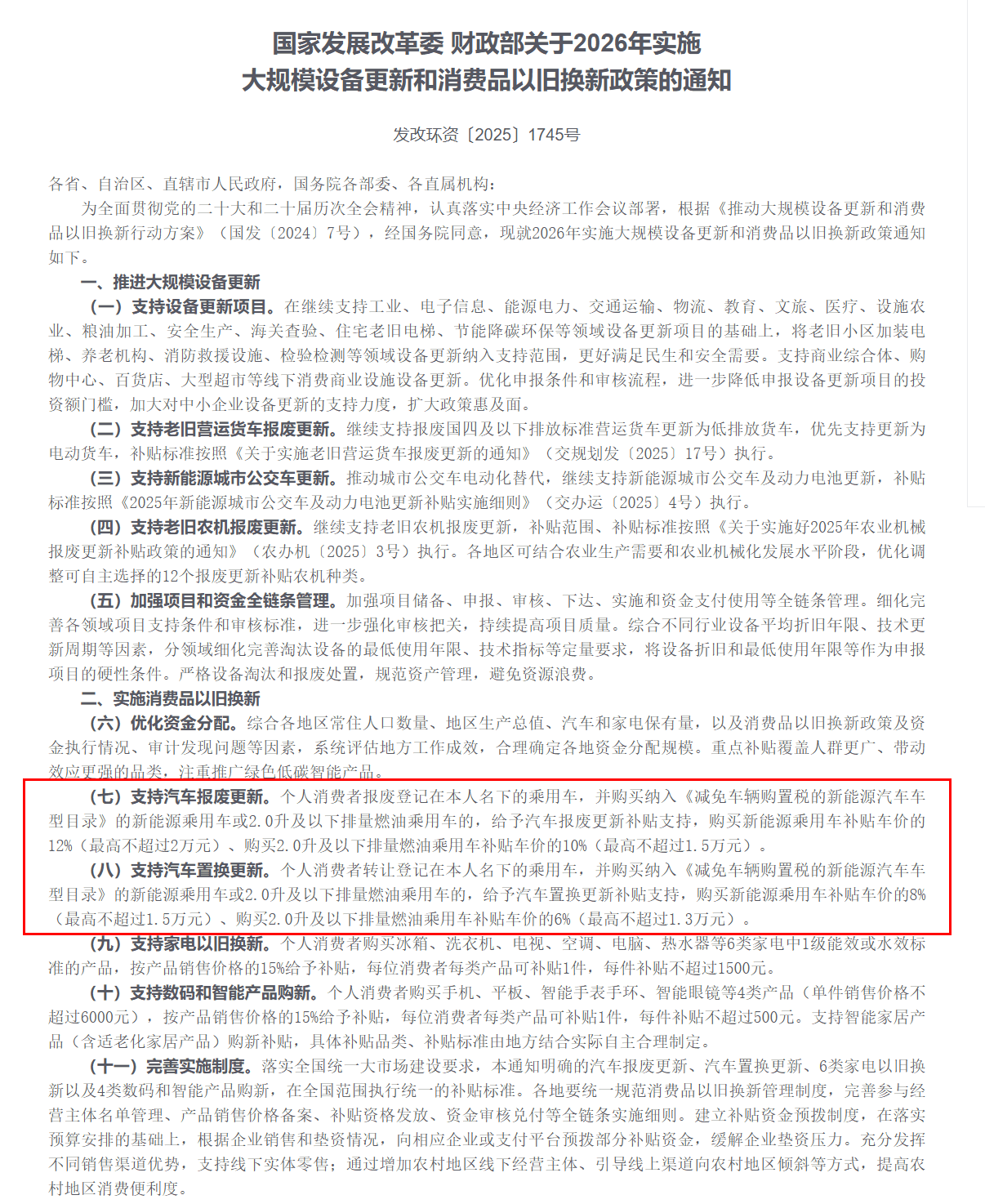 国家发展改革委、财政部今日发布关于2026年实施大规模设备更新和消费品以旧换新政策的通知。其中指出,2026年以旧换新政策支持汽车报废/置换更新。