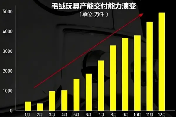 大量补货的背后是毛绒品类产能的提升。泡泡玛特方面在2025年中期业绩发布会上表示,8月份毛绒玩具产能约3000万件,与去年同期及今年一季度相比有10倍以上的增幅,预计今年12月份毛绒玩具交付能力将达到单月5000万件。