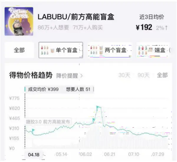 同日,隐藏款“本我”成交均价亦达到峰值4522.5元,溢价44.7倍。618大促期间多轮预售之后,二手前方高能价格“跳水”,伴随之后的多次补货,价格不断下跌。截至12月31日,其单个盲盒成交均价为116.1元,隐藏款“本我”成交均价为569.9元,分别较峰值下跌81.8%和87.4%。