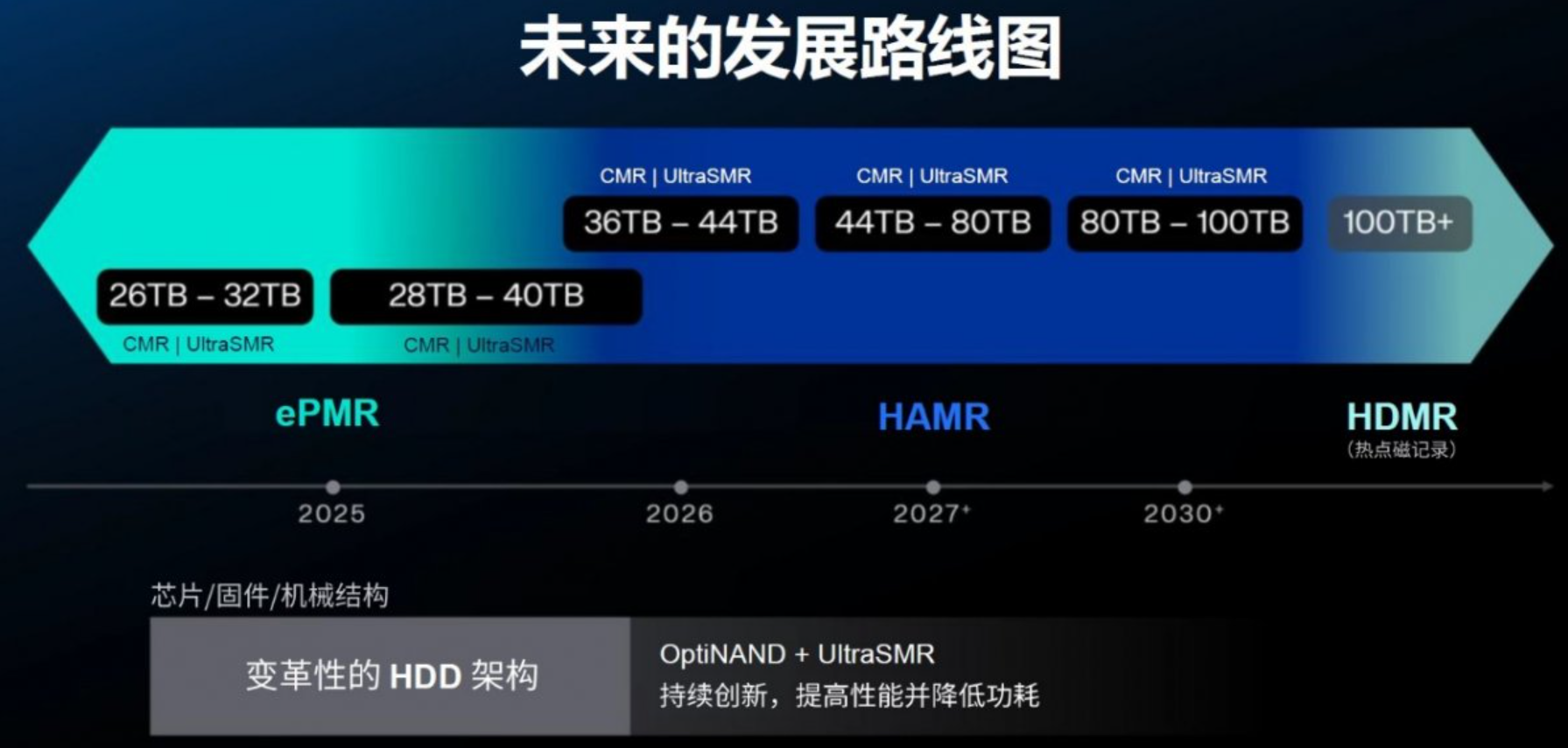 25年及之前的容量做到了32TB,靠的是11碟封装和UltraSMR,今年西数则会推出28TB容量的CMR硬盘,以及UltraSMR技术的40TB硬盘,今年完成这两个产品的技术认证。