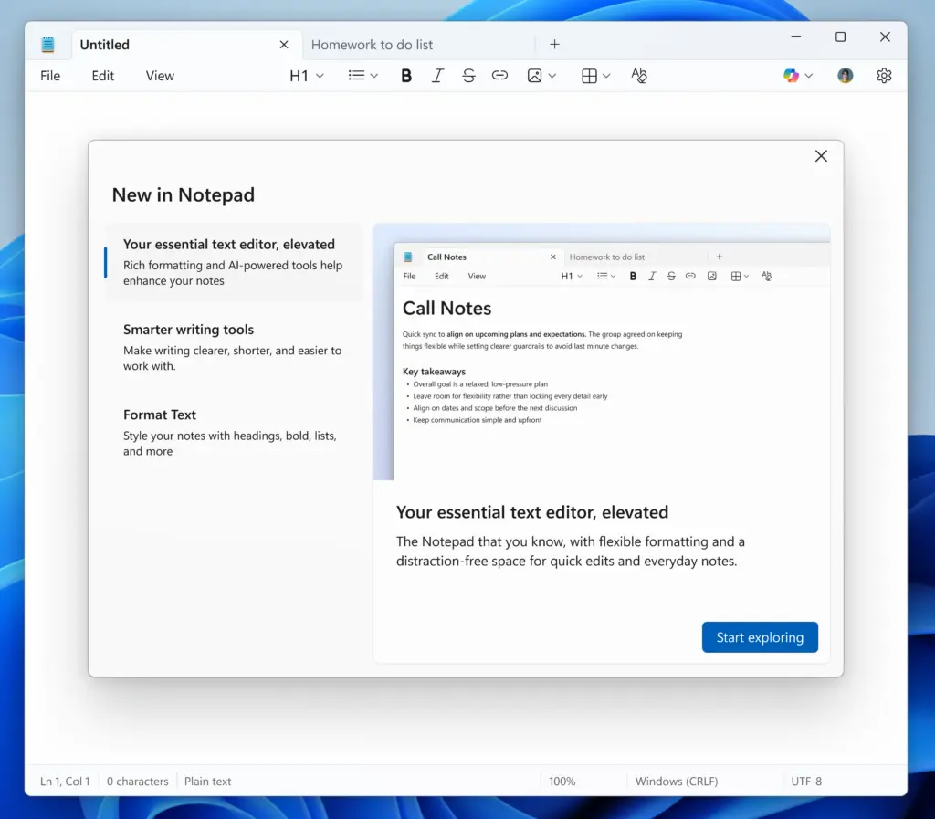Windows 11 版记事本更新至 11.2512.10.0 版本,新加入了删除线和嵌套列表两类 Markdown 格式工具,使用户在编辑文本时可以实现更丰富的结构和标注。 同时,应用内新增了一个欢迎体验界面,用于向用户介绍记事本中的最新功能,用户可通过点击工具栏右上角的扩音器图标随时重新打开这一界面。 微软还改进了记事本在调用本地或云端 AI 进行“撰写、改写或总结”文本时的文本流式呈现方式,让生成结果以更流畅的方式即时显示,而无需等待 AI 一次性返回整段内容。