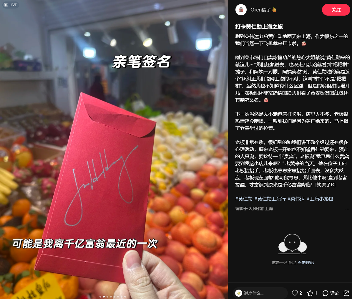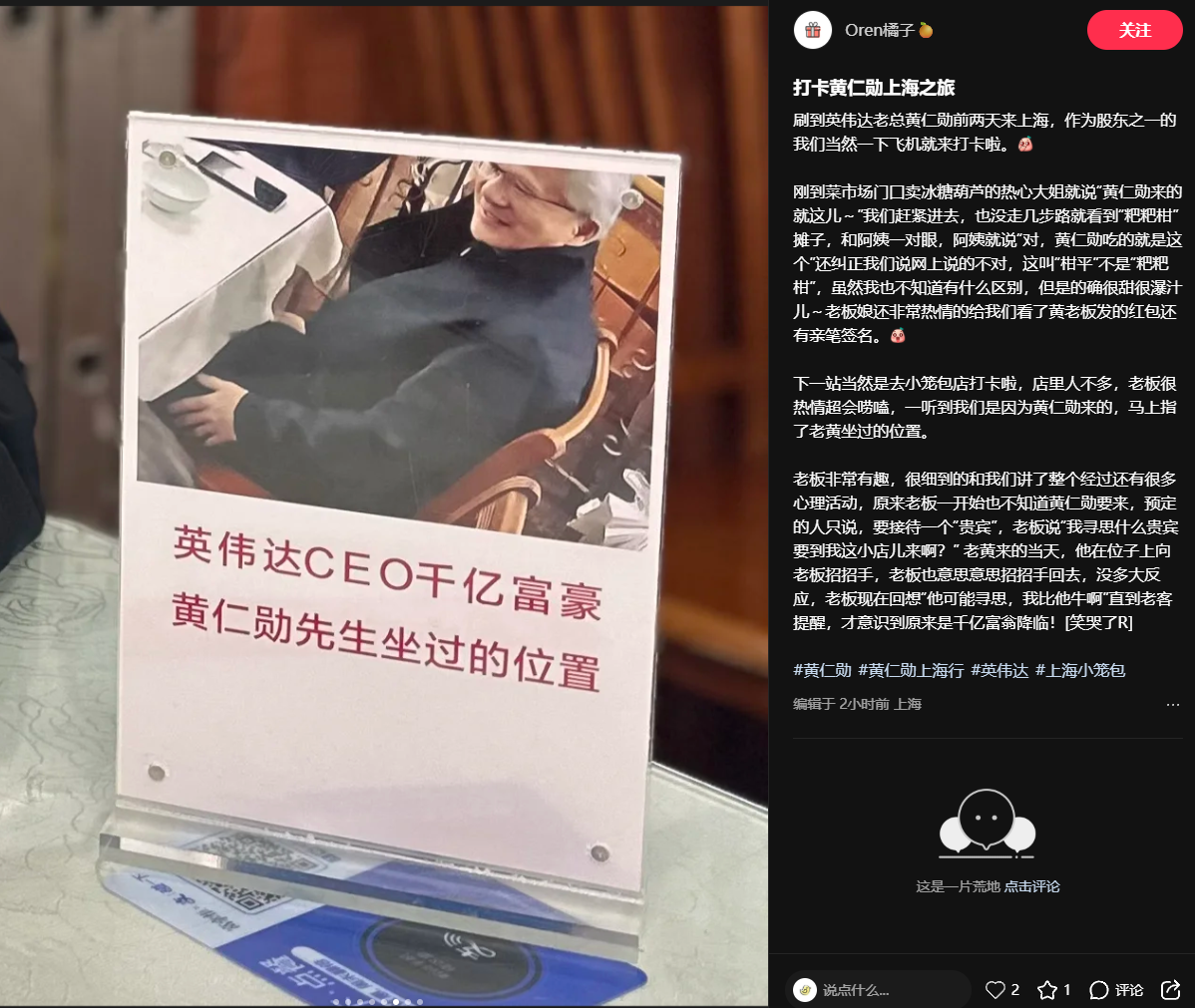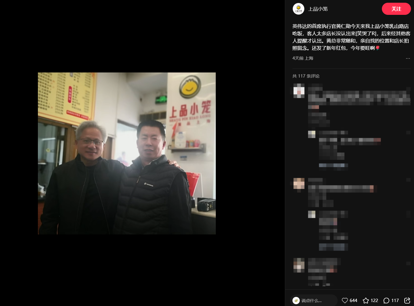 据悉,黄仁勋还在乳山路的上品小笼用餐,店主表示:“黄总非常随和,亲自找的位置并和店长拍照留念,还发了新年红包。”