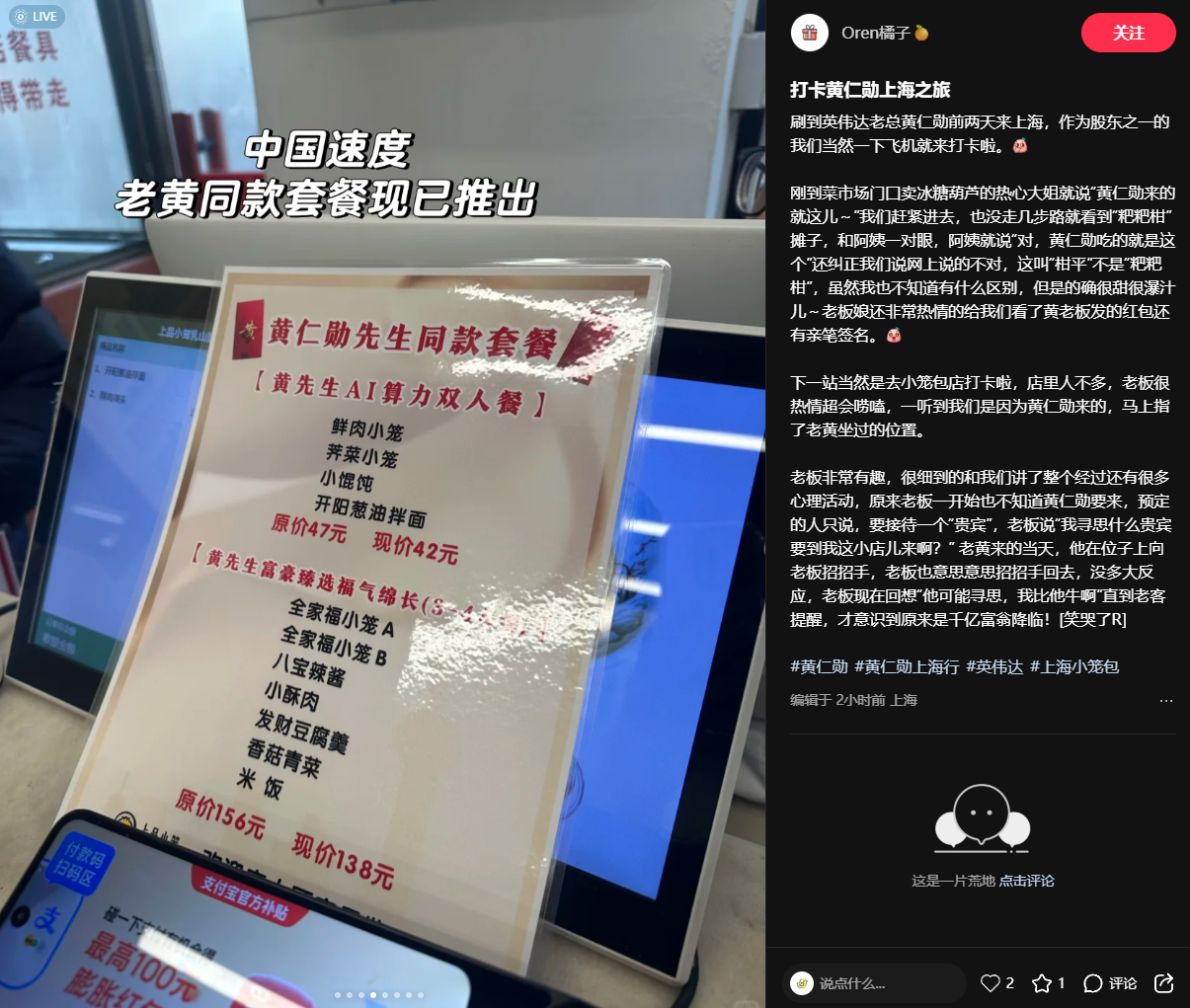 ∞ AI教父黄仁勋上海吃小笼包 店家火速推出同款AI算力套餐 42元起