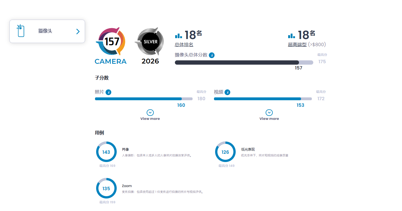 日前,评测机构DXOMARK公布三星新一代机皇Galaxy S26 Ultra的影像成绩。在DXOMARK影像第六版基准测试中,三星S26 Ultra获得157分,在全球影像排行榜中位列第18。