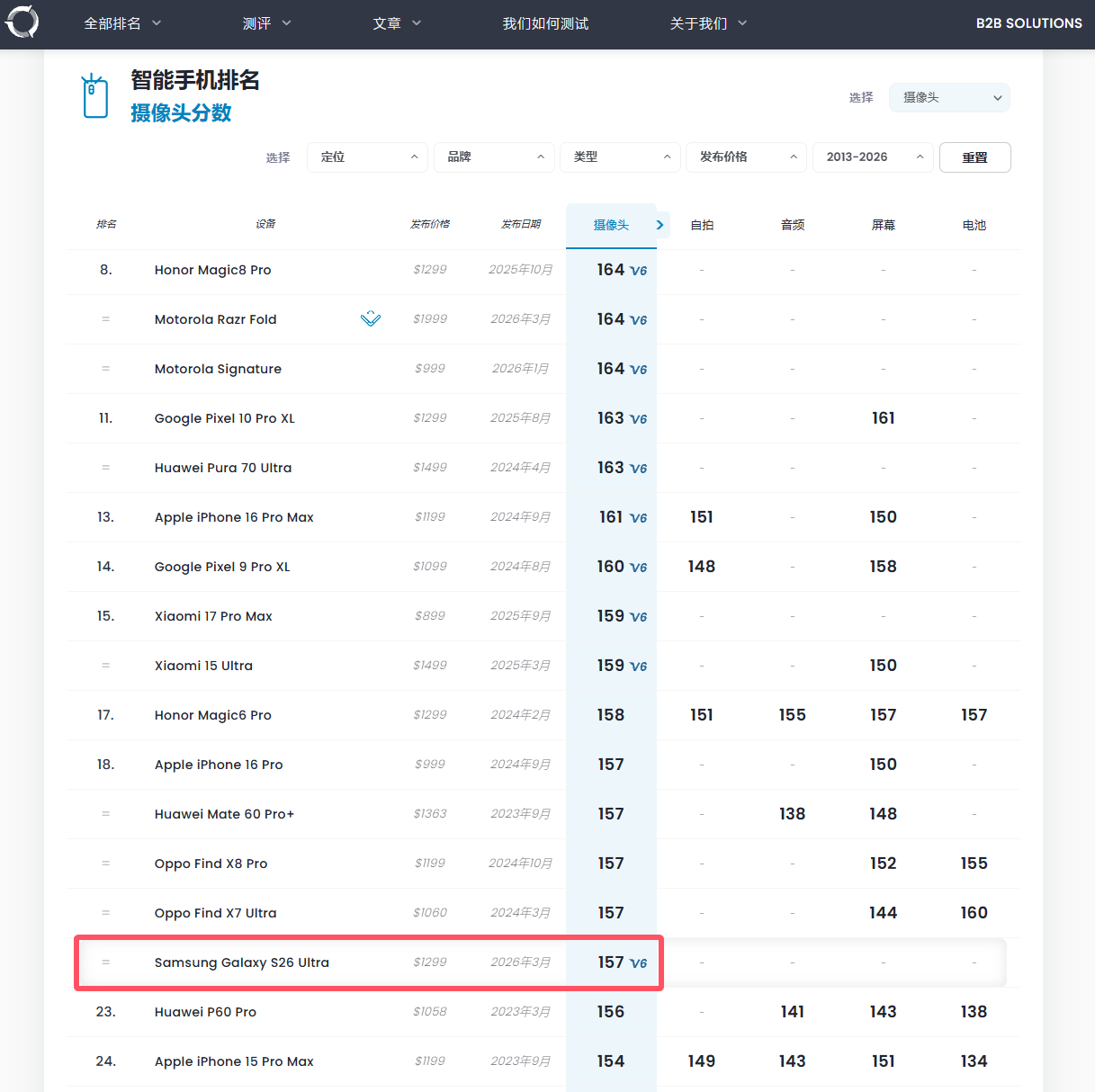∞ 三星Galaxy S26 Ultra DXO影像得分157:全球第18 不敌小米17 Pro Max