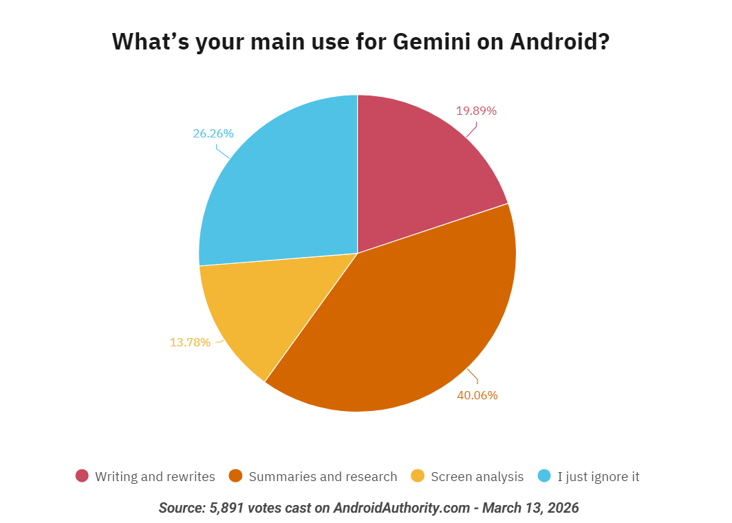 由于海外安卓手机基本上搭载的是谷歌Gemini助理,因此Android Authority针对其用户进行了Gemini使用习惯调查,共收集将近6000名网友意见。