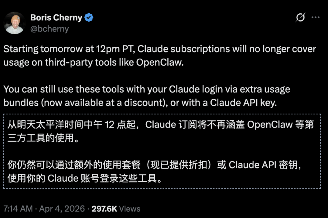 Anthropic给成千上万OpenClaw用户发出通知:明天起,你的Claude订阅额度不能再给OpenClaw用了,想继续,那就按量计费吧。