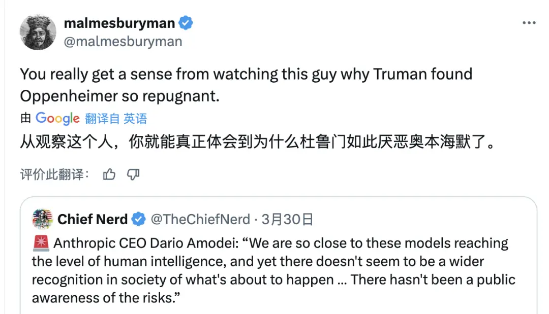 3月30日,X平台上一条转发视频的评论炸开了锅。用户@malmesburyman转发了Anthropic CEO Dario Amodei的采访片段,配文:你真的能从这家伙身上感受到为什么杜鲁门觉得奥本海默那么令人厌恶。