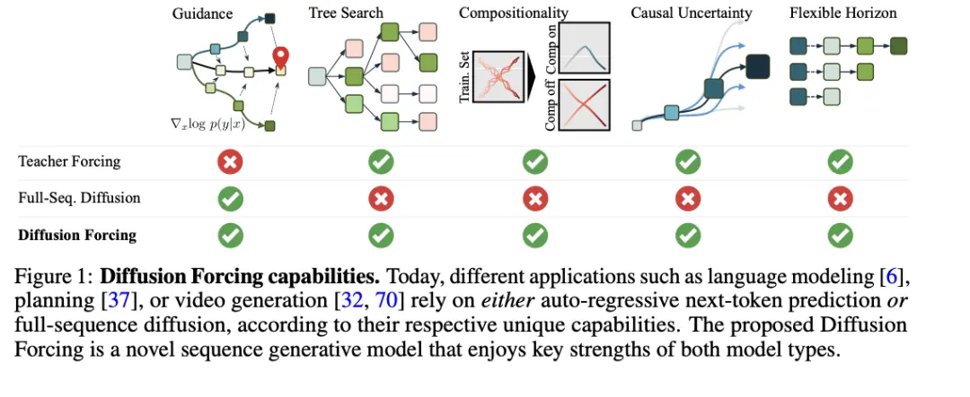 这项研究提出Diffusion Forcing这一全新序列生成训练范式,将逐token独立噪声级扩散与因果下一个token预测结合,融合自回归模型的可变长度生成与全序列扩散模型的长程引导优势。