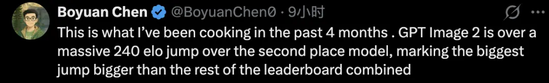 陈博远的一条推文还透露,从去年12月底的GPT Image 1.5算起,只用了四个月就有如此大的改进。