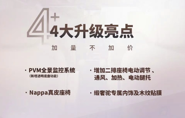 内饰维持原有设计风格,并针对配置层面进行升级,据官方表示,此次改款将提供PVM全景监控系统、Nappa真皮座椅、增加二排座椅电动调节/通风/加热/电动腿托、缎奢驼专属内饰以及木纹贴膜等。