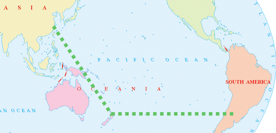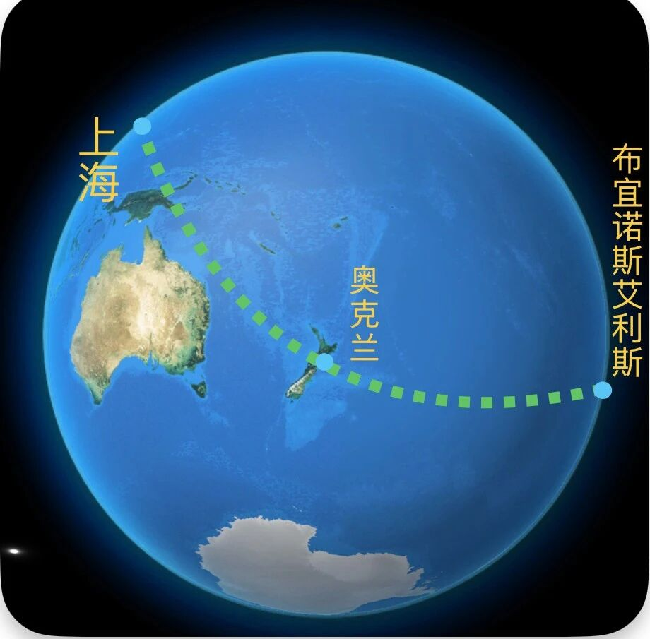 有趣的来了:奥克兰几乎正好在上海—布宜诺斯艾利斯的“大圆航线”上,因此经停只比全程直飞的理论最短距离增加200公里,完全可以忽略不计。